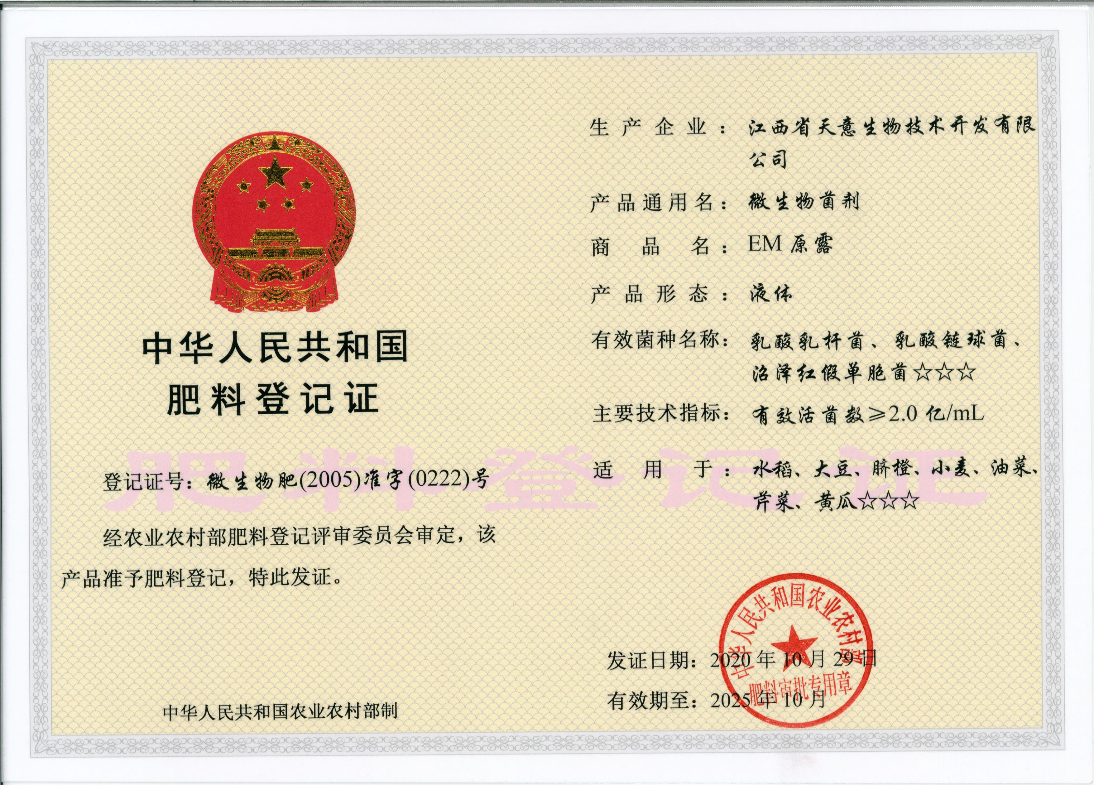 2001 2001年,EM原露獲得農業部下發的飼料添加劑生產許可證和微生物肥料登記證。