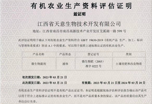 喜訊:江西天意生物產品“EM原露”通過“有機農業生產資料評估證明”認證 2023年4月6日,江西天意生物集團收到了來自國內權威第三方認證機構南京國環有機產品認證中心出具的“有機農業生產資料評估證明”。