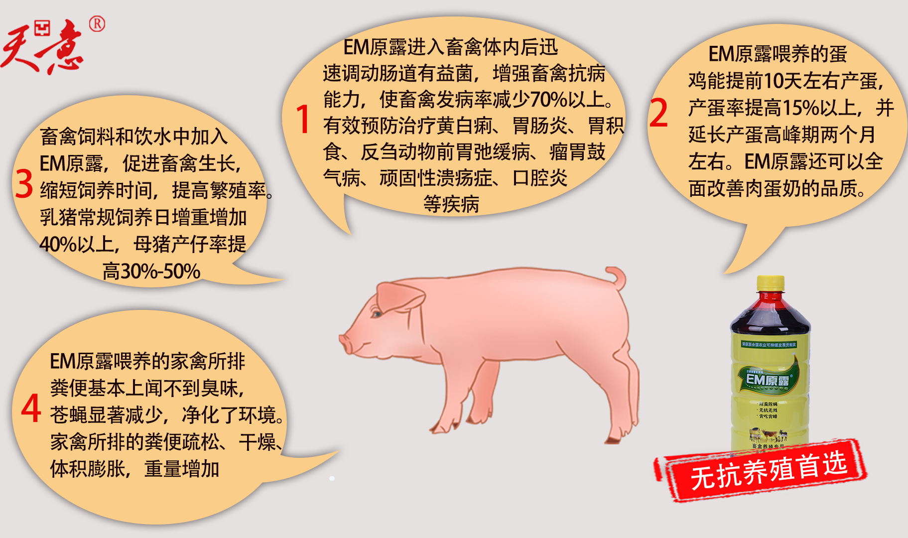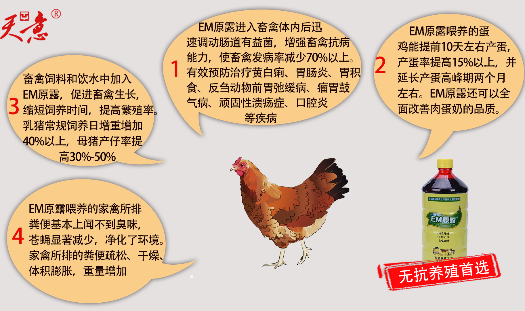 值得一提的是,天意主打產品EM原露擁有首屈一指的質量和旺盛的生命力。公司經營30年來,從未發生過任何一起產品質量安全事故,18年也未花過一分錢廣告費,全靠用戶們口口相傳推廣,做到了市場覆蓋全國各省,用戶達540萬(其中種植戶150多萬戶,畜牧養殖戶 130多萬戶,水產養殖戶 260多萬戶)的奇跡。