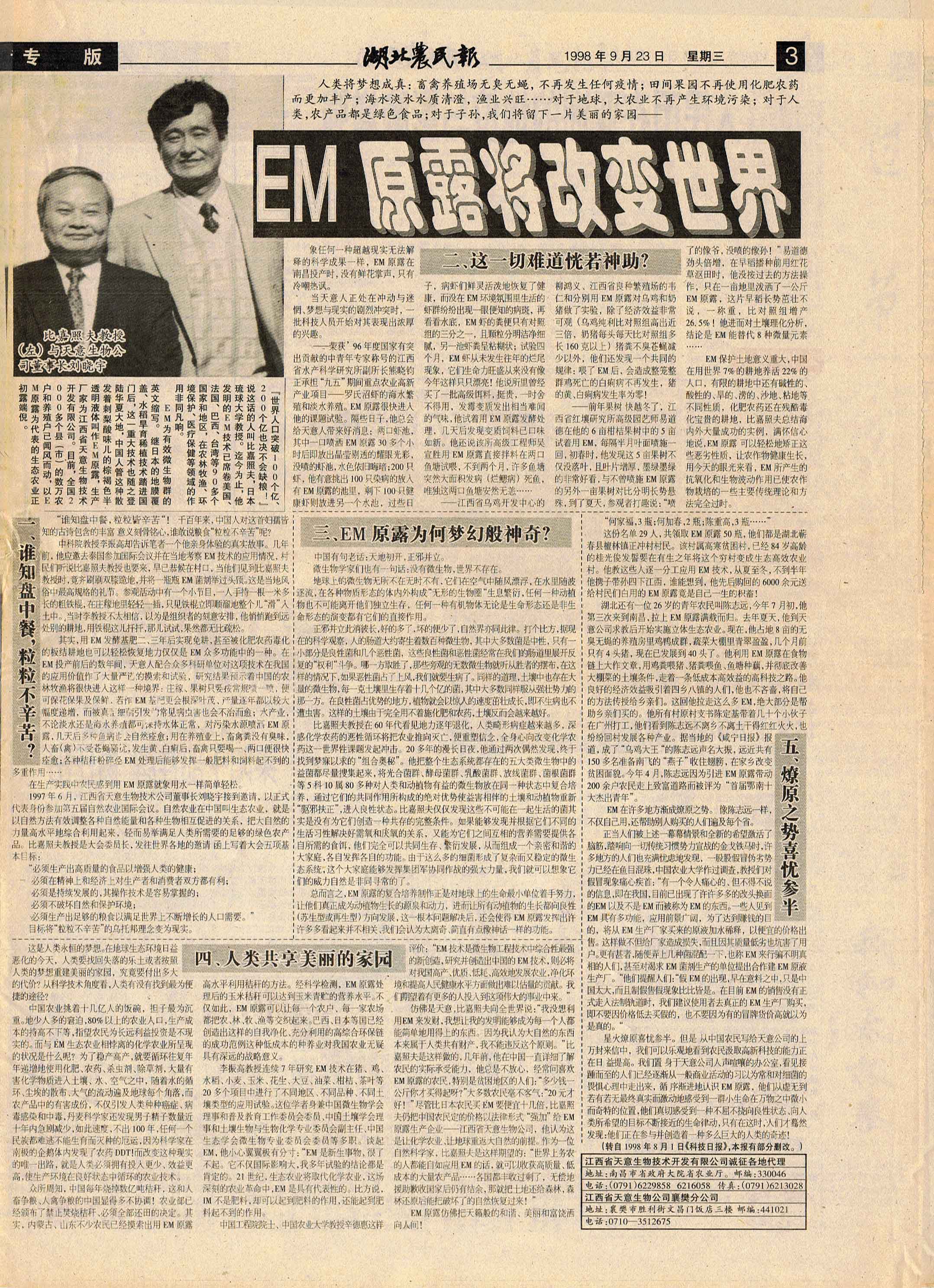 EM原露是“有效微生物群”,其由光合菌、酵母菌、乳酸菌等80多種有益微生物組成。它會與所到之處的良性力量迅速結合,產生抗氧化物質,消除腐敗,抑制病原菌,形成良好的生態環境。